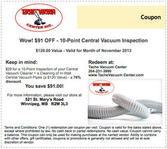 Keep a peace of mind by purchasing our 10-point no-obligation inspection of your central vacuum cleaner plus a cleaning of your in-wall central vacuum pipes for $29 (total value $120.00).